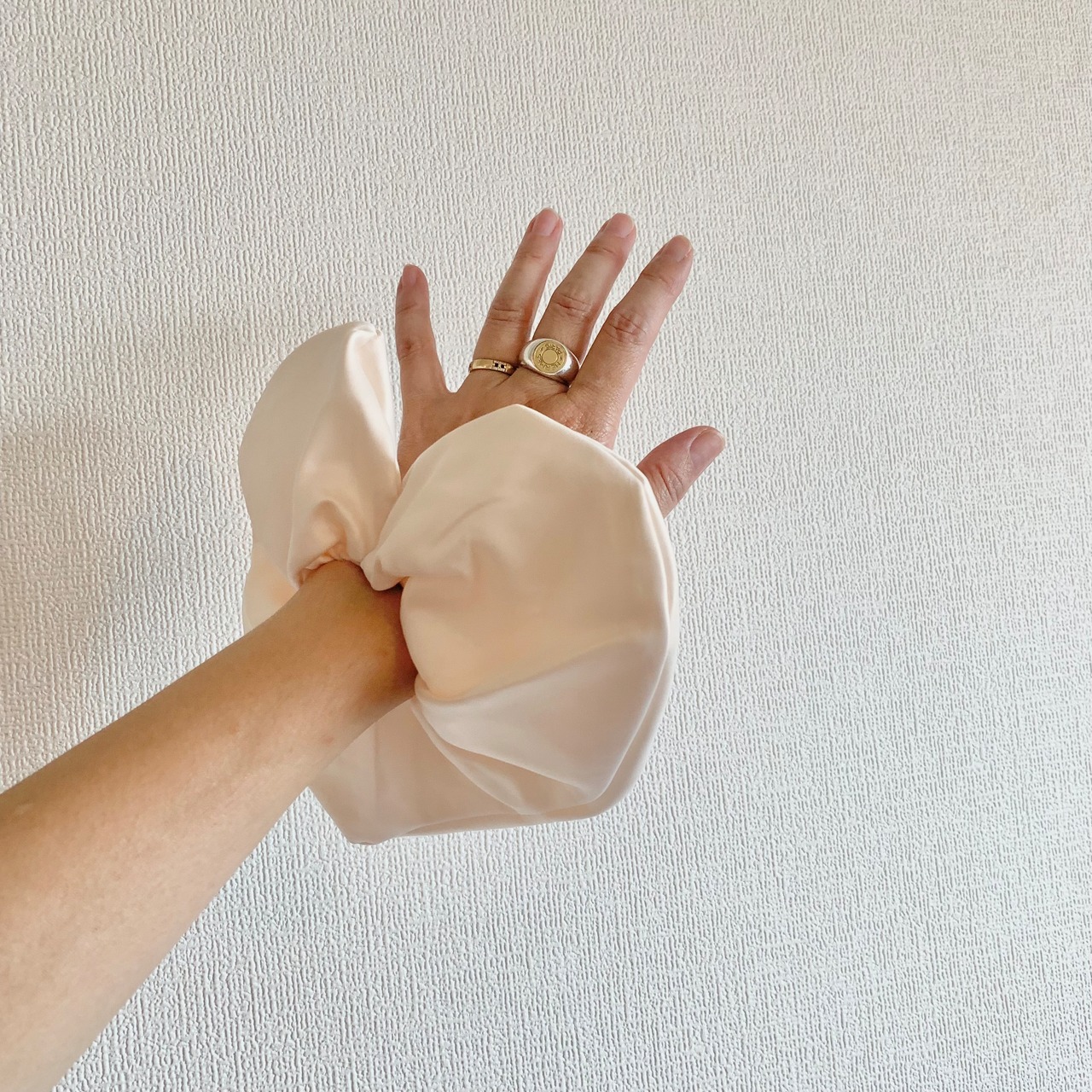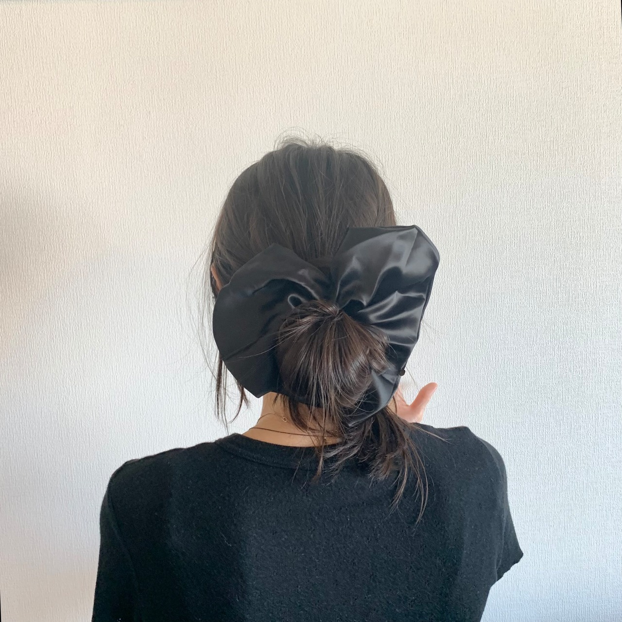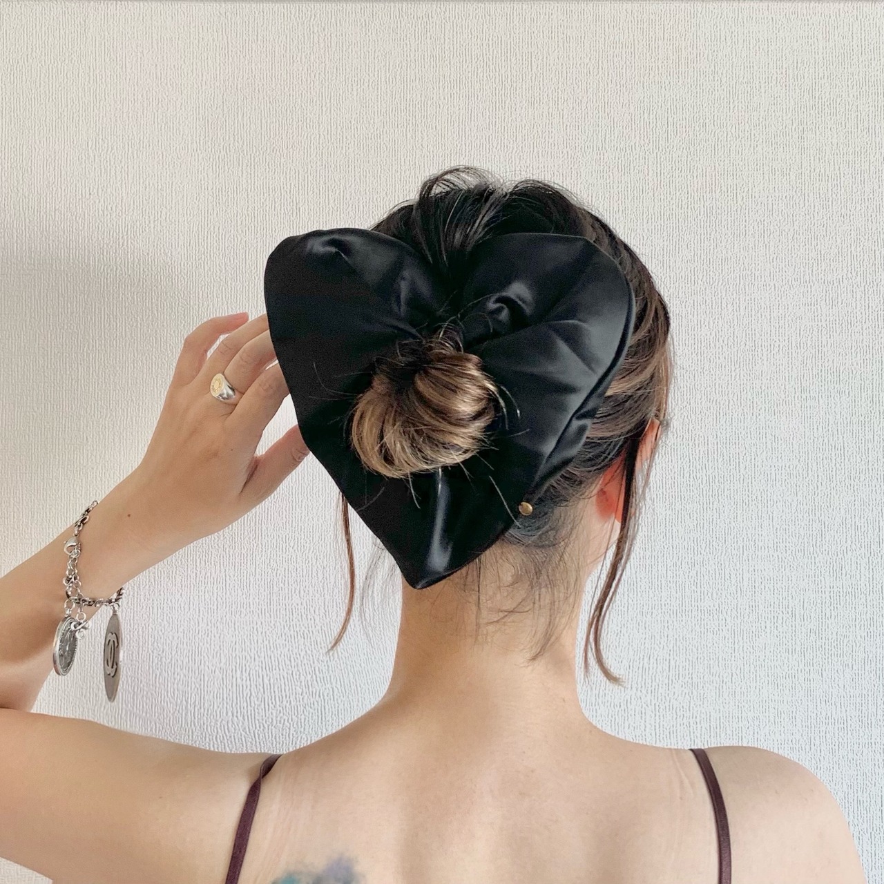 サテン素材のハート形シュシュは、可愛らしさと上品さを兼ね備えたアイテムです。