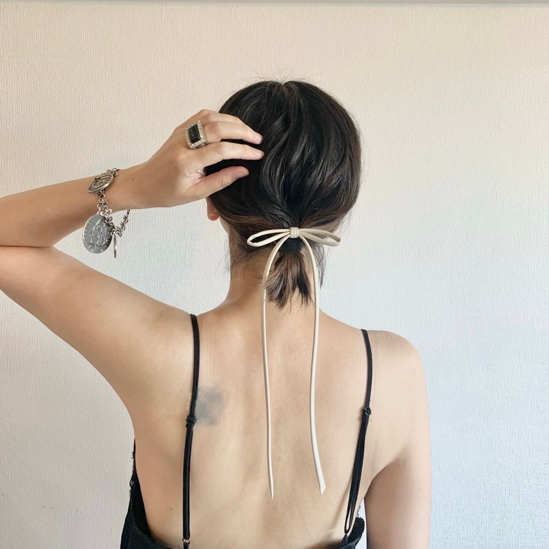 細めのロングリボンヘアゴムは、シンプルながらも高級感があり、洗練された印象を与えるアイテムです。