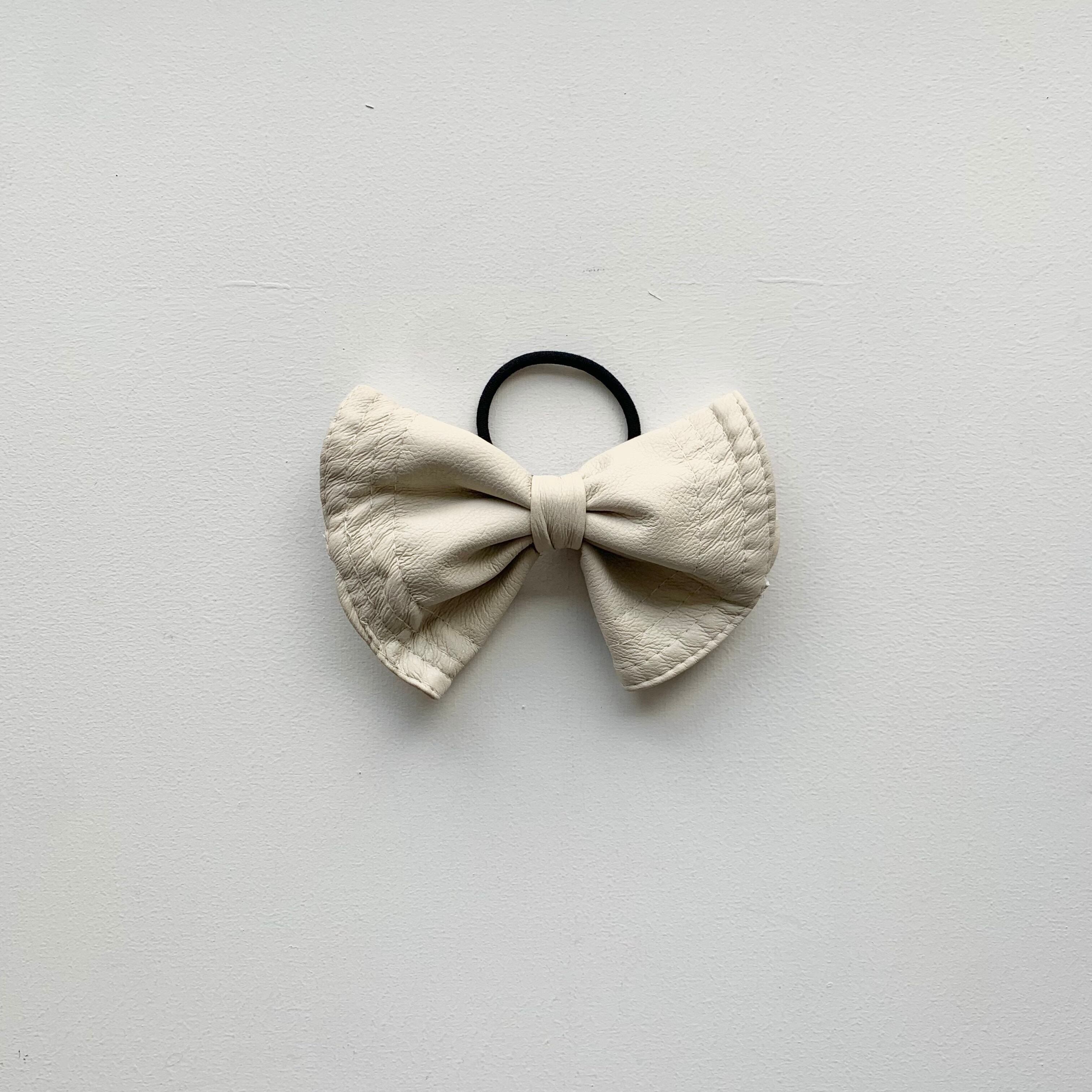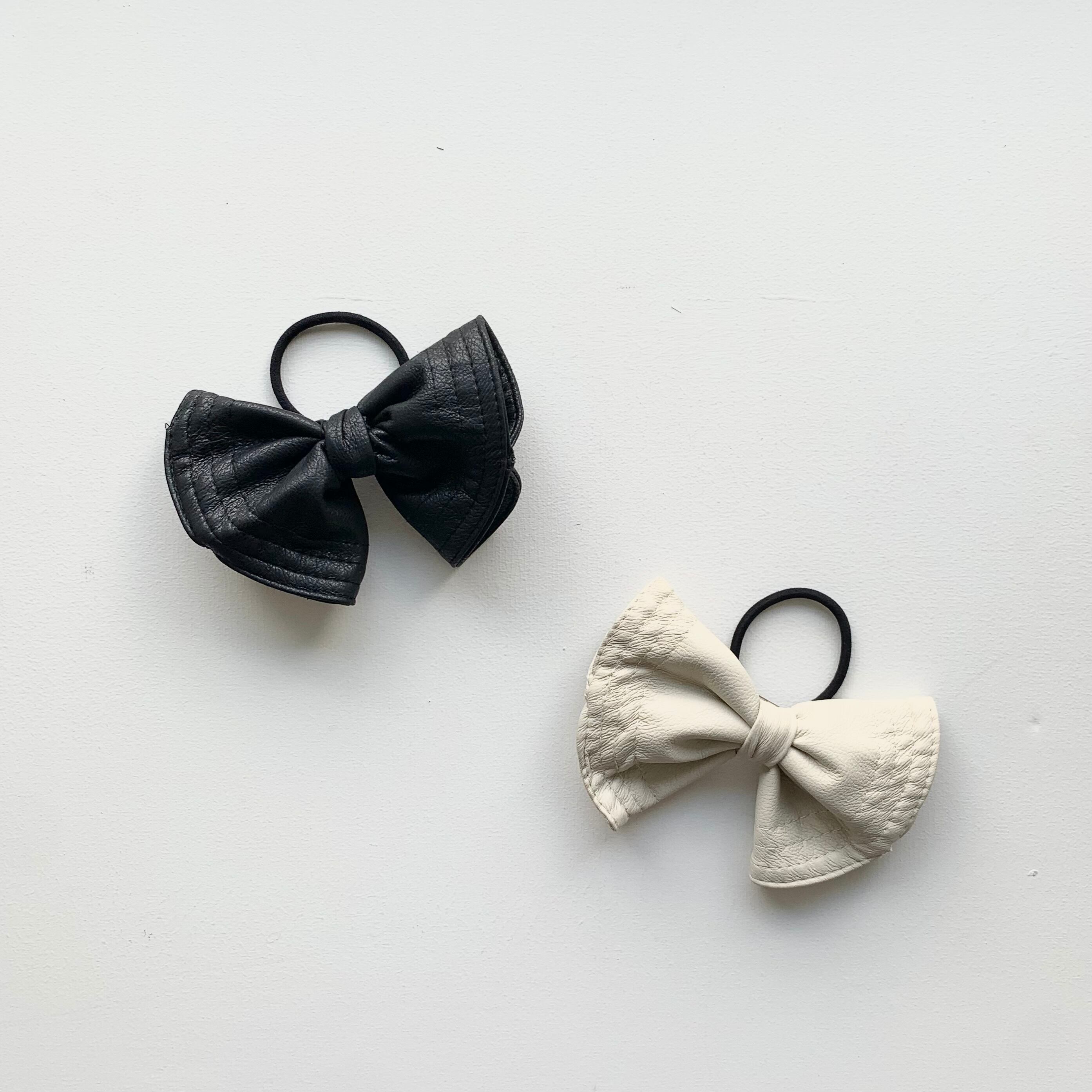 レザー調のステッチリボンヘアゴムは、リボンモチーフでありながらサイドのステッチがスタイリッシュな印象を与えます。