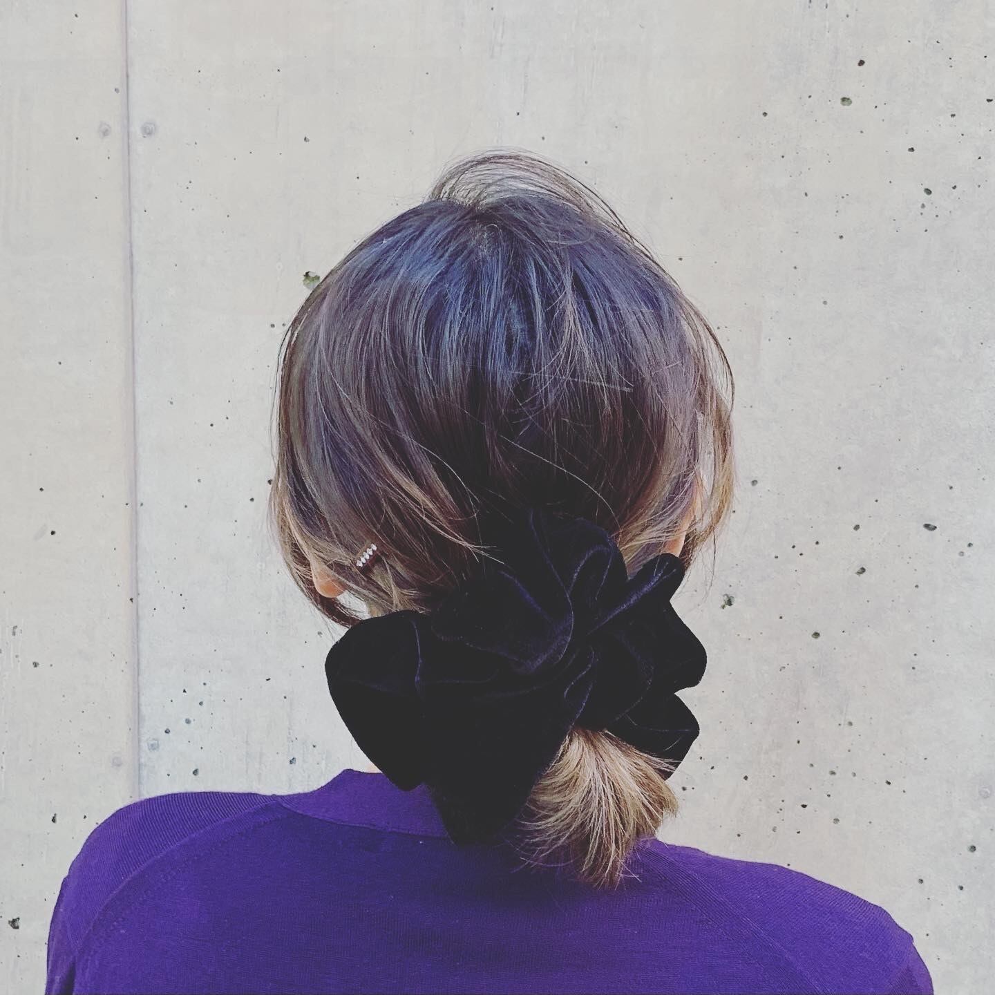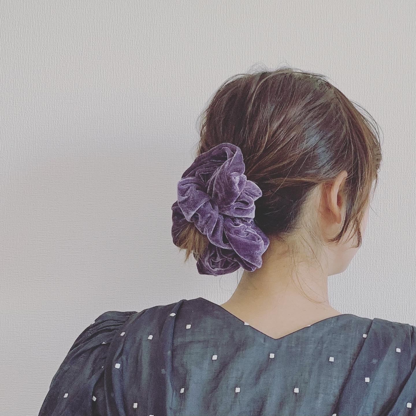 簡単に一つにまとめてシュシュを付けるだけでまとめ髪アレンジが完成。